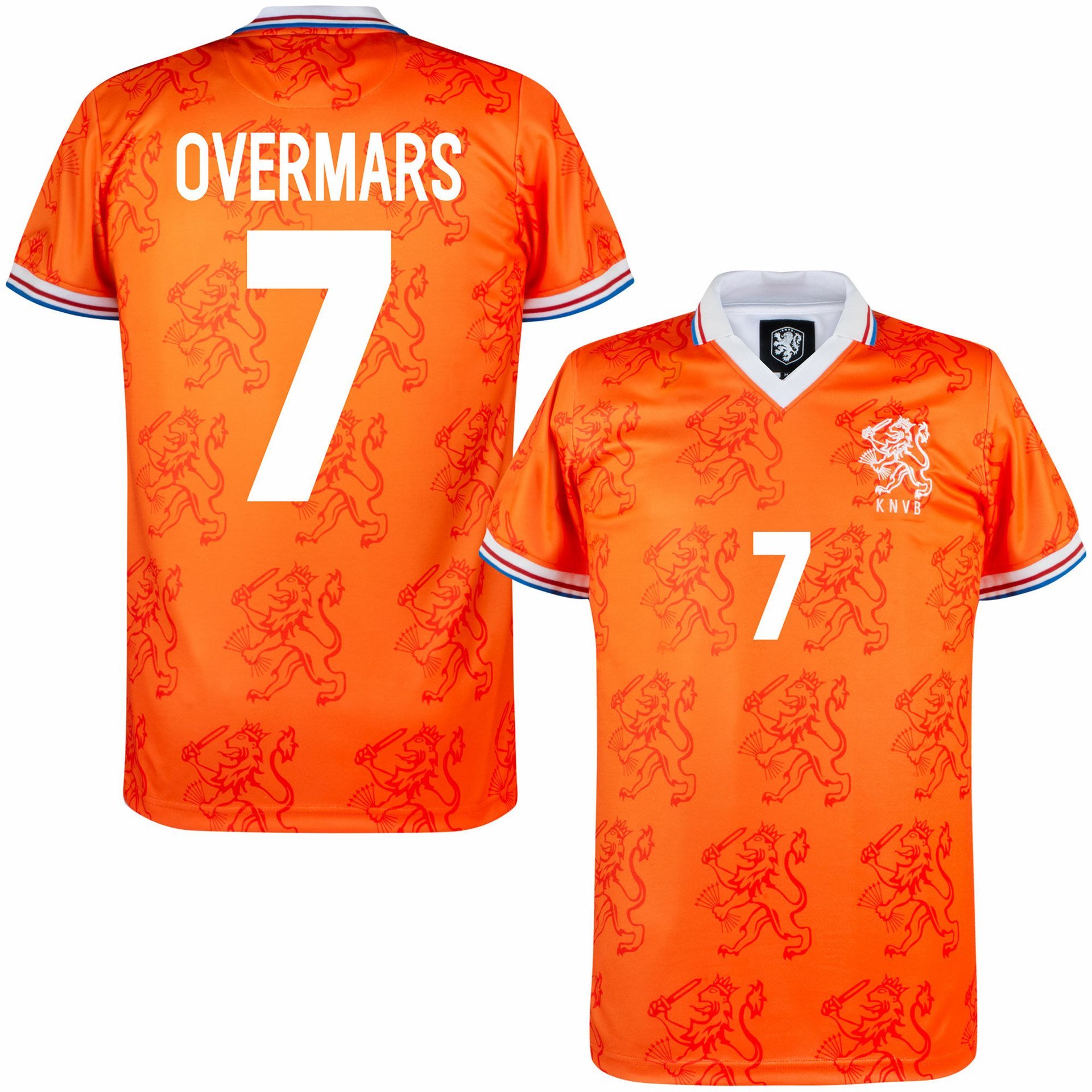 Maillot de foot rétro de l'équipe nationale néerlandaise de COPA Football de la collection officielle KNVB. Le maillot porte le nom OVERMARS et le numéro 7. Ce maillot contient également un numéro de poitrine 7. Ce maillot rétro est basé sur le maillot de football qui a été porté lors de la Coupe du monde 1994 en Amérique. La chemise rétro Holland est principalement orange et se caractérise par un imprimé intégral du lion du logo KNVB. Ce logo est également appliqué en blanc sur la poitrine gauche. De plus, la chemise a un col polo et un col en V. Le col polo et le passepoil sont aux couleurs du drapeau néerlandais, rouge-blanc-bleu. Cool maillot rétro de football de l'équipe nationale néerlandaise pour le vrai fan d'Orange! Les chemises rétro COPA ont une coupe classique. Joli maillot pour le King's Day, un championnat d'Europe ou une coupe du monde de football.