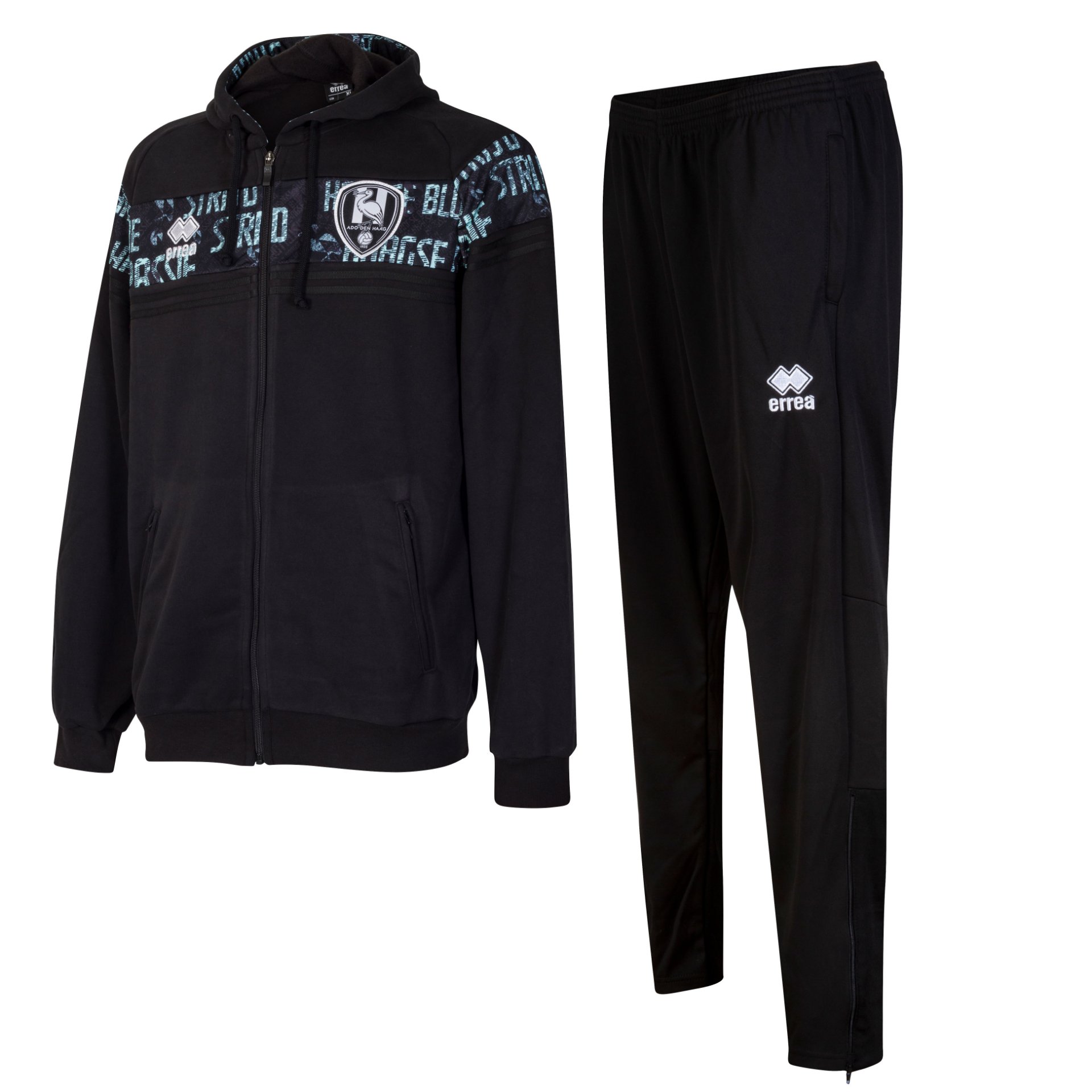 Voici la tenue d'entraînement officielle de l'ADO Den Haag, conçue par Errea. Les joueurs de l'ADO Den Haag portent cette tenue de présentation avant les matchs de préparation de l'Eredivisie et de la Coupe des Pays-Bas (KNVB Cup) pour la saison 2020-2021. Cette tenue se compose d'un sweat à capuche zippé et d'un pantalon d'entraînement. Le sweat est entièrement noir avec des détails vert menthe. Une bande portant l'inscription « HAAGSE BLUF » est apposée sur la poitrine. Le logo du sponsor Errea est apposé sur la poitrine droite, tandis que celui de l'ADO Den Haag figure sur la poitrine gauche. Le pantalon d'entraînement est entièrement bleu marine et arbore le logo Errea sur la jambe droite et celui de l'ADO Den Haag sur la jambe gauche. Il est également doté de deux poches latérales. La taille élastiquée permet un ajustement optimal. Une tenue idéale pour l'entraînement, surtout pour les vrais supporters de l'ADO Den Haag ! Composition : 100 % polyester.