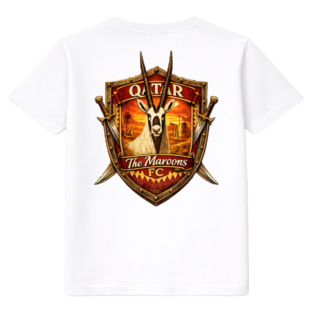 T-shirt Qatar épais et élégant de FC ELEVEN pour adultes. Ce T-shirt épais est fabriqué en coton biologique lourd. Le dos du T-shirt présente un imprimé en forme de bouclier avec une impression 3D d’un oryx arabe, le nom du pays et le surnom de l’équipe nationale: The Maroons! L’imprimé comporte également des épées sur les côtés.
