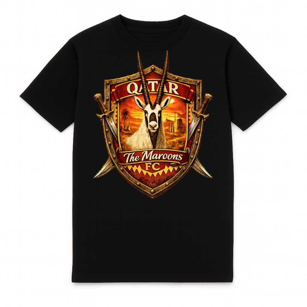T-shirt lourd Qatar élégant de FC ELEVEN pour adultes. Ce t-shirt lourd est fabriqué en coton biologique épais. Le dos du t-shirt présente une impression d’un bouclier avec une impression 3D d’un oryx arabe, le nom du pays et le surnom de l’équipe nationale : The Maroons ! De plus, l’impression sur les côtés comprend des épées. L’avant du t-shirt est orné des initiales de la marque FC en noir sur la poitrine gauche. Il s’agit d’un logo en silicone. Le t-shirt est entièrement noir et doté d’un col rond. Il est fabriqué en coton épais et possède une coupe normale. Matière : 100 % coton biologique.