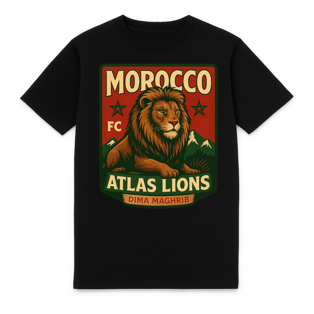 Superbe T-shirt de football FC ELEVEN pour adultes. Le T-shirt épais est fabriqué en coton biologique lourd. La caractéristique distinctive du T-shirt est l’impression graphique colorée du Maroc au dos. L’impression comporte le texte Morocco et Atlas Lions (surnom de l’équipe nationale de football du Maroc), avec au centre un lion rugissant. Le T-shirt est également orné des initiales de la marque FC en noir sur la poitrine gauche. Le T-shirt épais est entièrement noir et doté d’un col rond. Fabriqué en coton lourd, il présente une coupe régulière. Matière : 100% coton biologique.