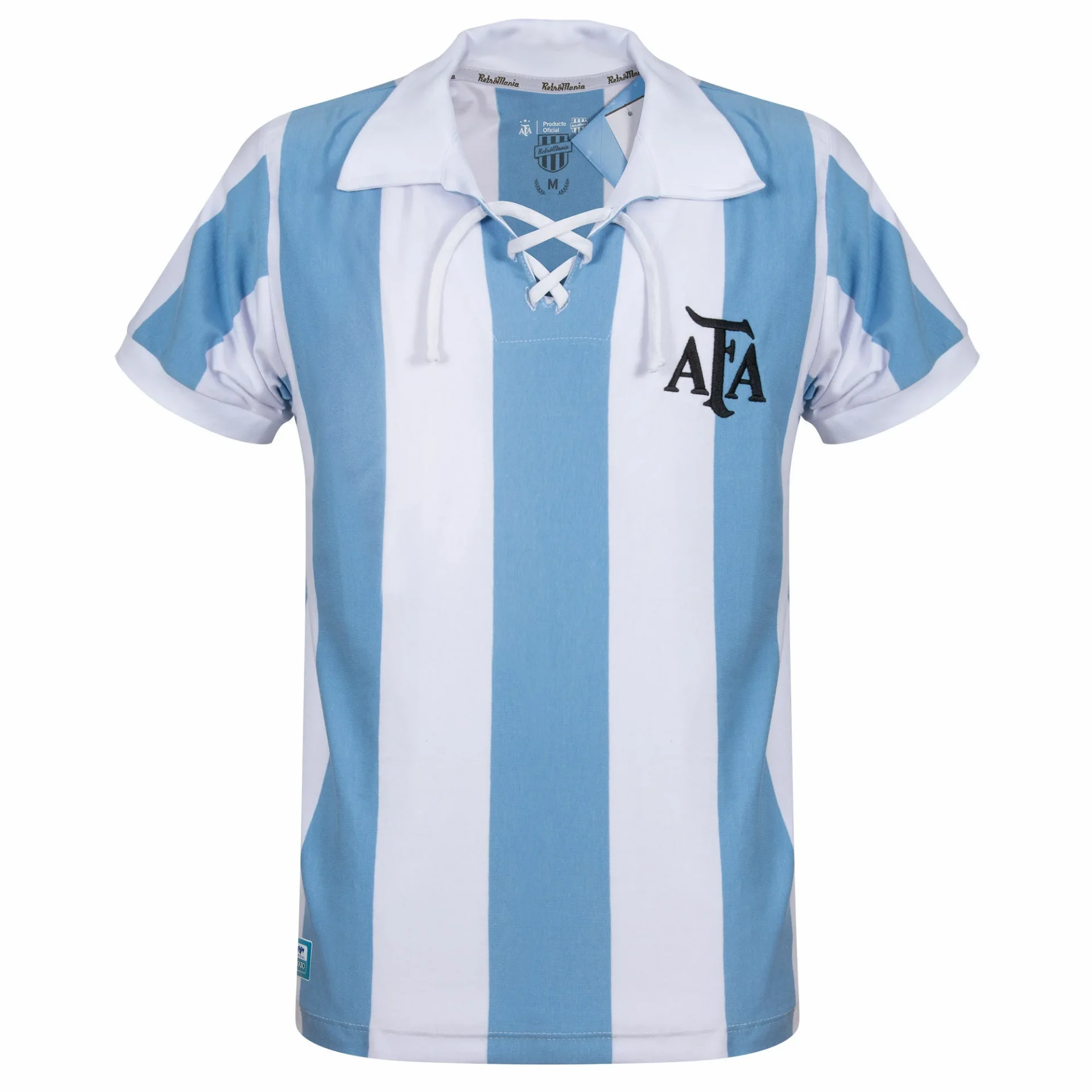Maillot de football rétro Argentine Coupe du Monde 1930 pour adultes. Les initiales de la Fédération Argentine de Football AFA sont présentes sur la poitrine gauche. Rayures classiques bleu clair et blanches, col polo et encolure avec laçage rétro. Coupe normale. Matière : 100 pour cent coton.