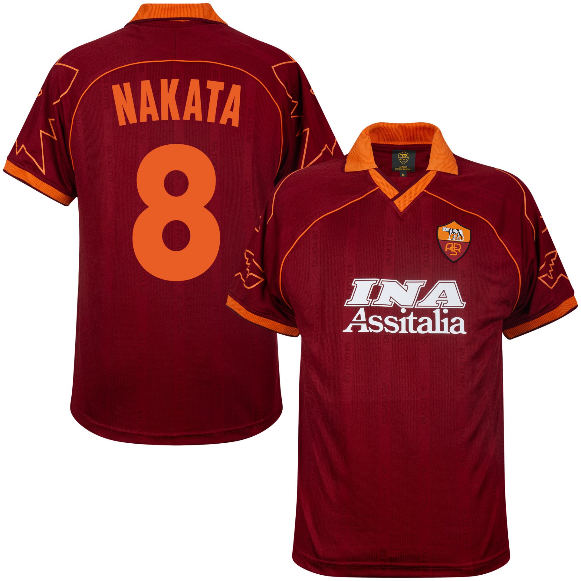 Maillot rétro de l'AS Roma (saison 1999-2000) par COPA Football, issu de la collection officielle du club. Le dos arbore le portrait de la légende de l'AS Roma, Nakata (8). Ce maillot rétro est inspiré du maillot domicile de la saison 1999/00. Il est à manches courtes et arbore la couleur rouge foncé traditionnelle. Le loup romain orange est présent sur les deux manches. Le col polo et les liserés sont également orange. Le nom du sponsor de l'époque, INA Assitalia, est imprimé au centre de la poitrine. Sur la poitrine gauche figure le logo du club romain, orné du célèbre loup romain. Ce maillot a été porté par des joueurs tels que Montella, Totti, Delvecchio, Cafu, Aldair, Nakata et bien d'autres. Composition : 100 % polyester.